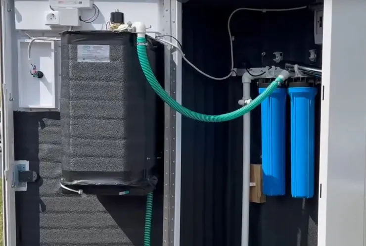 Чтобы всё работало, в нижней части родника установили ёмкость из нержавеющей стали – именно туда будет стекать вода. Оттуда она по трубам подаётся наверх, где и стоит сам водомат. Также проложили провода, чтобы оборудование работало без перебоев.