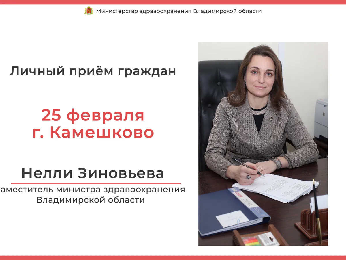 Заместитель министра здравоохранения Владимирской области Нелли Евгеньева Зиновьева проведёт личный приём граждан в городе Камешково. Встреча состоится 25 февраля в администрации Камешковского района по адресу: г. Камешково, ул. Свердлова, 10.