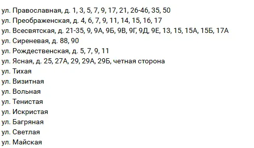 В это время газ не будет поступать в жилые дома, расположенные по следующим улицам.