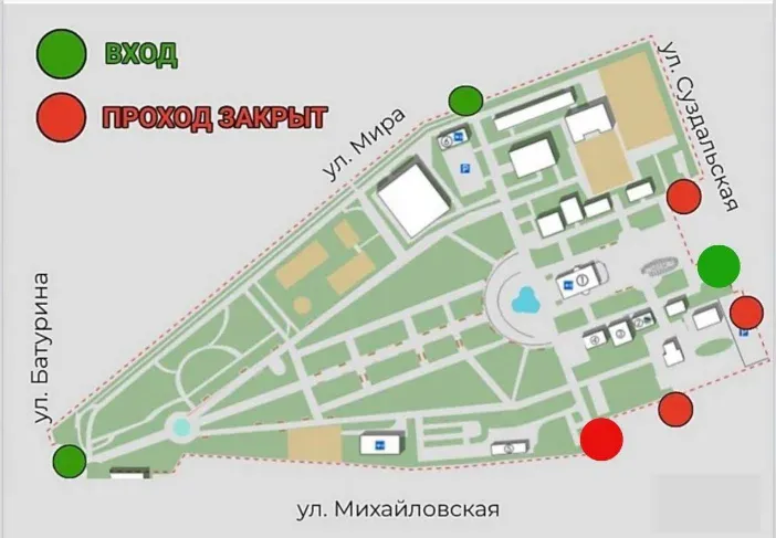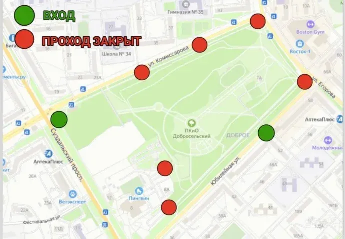 В Центральном парке посетителей будут пускать через главный вход, калитку рядом с колесом обозрения и вход со стороны улицы Мира. В парк «Добросельский» можно будет зайти с двух сторон – через центральный вход с Суздальского проспекта и калитку со стороны улицы Юбилейной. Все остальные проходы на это время закроют.