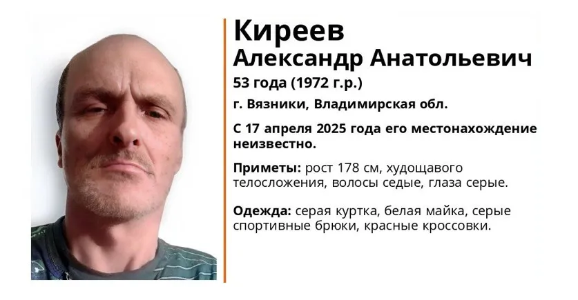 В городе Вязники более месяца не могут найти мужчину, исчезнувшего при невыясненных обстоятельствах. Как сообщили в региональном штабе поискового отряда «ЛизаАлерт», разыскивается Киреев Александр Анатольевич, 1972 года рождения.