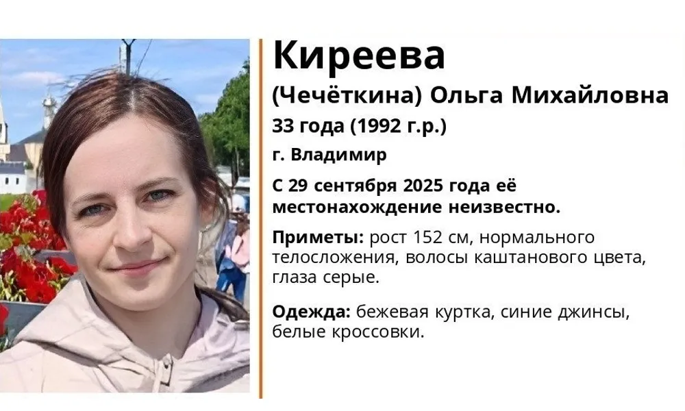 Поисковый отряд «ЛизаАлерт» Владимирской области сообщил о пропаже 33-летней Ольги Киреевой (Чечёткиной), жительницы Владимира. С 29 сентября 2025 года о её местонахождении ничего не известно.